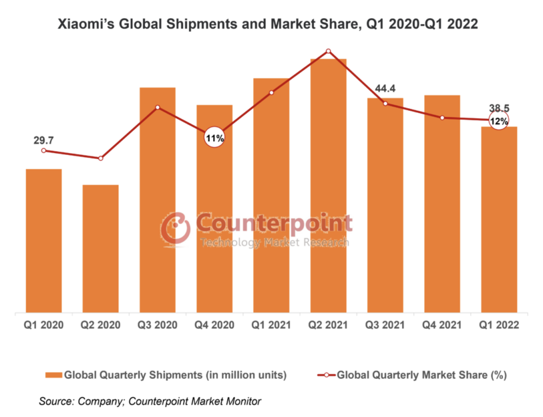 依据Counterpoint的商场监测数据显现,2022年Q1 因为4G SoC等重要零部件的长时间缺少、新冠疫情的重复以及全球宏观经济下行等要素,全球和我国区域智能手机的出货量别离同比下降了8.1%和18.1%,在这些影响下,小米我国区域智能手机出货量同比下降了20.6%。