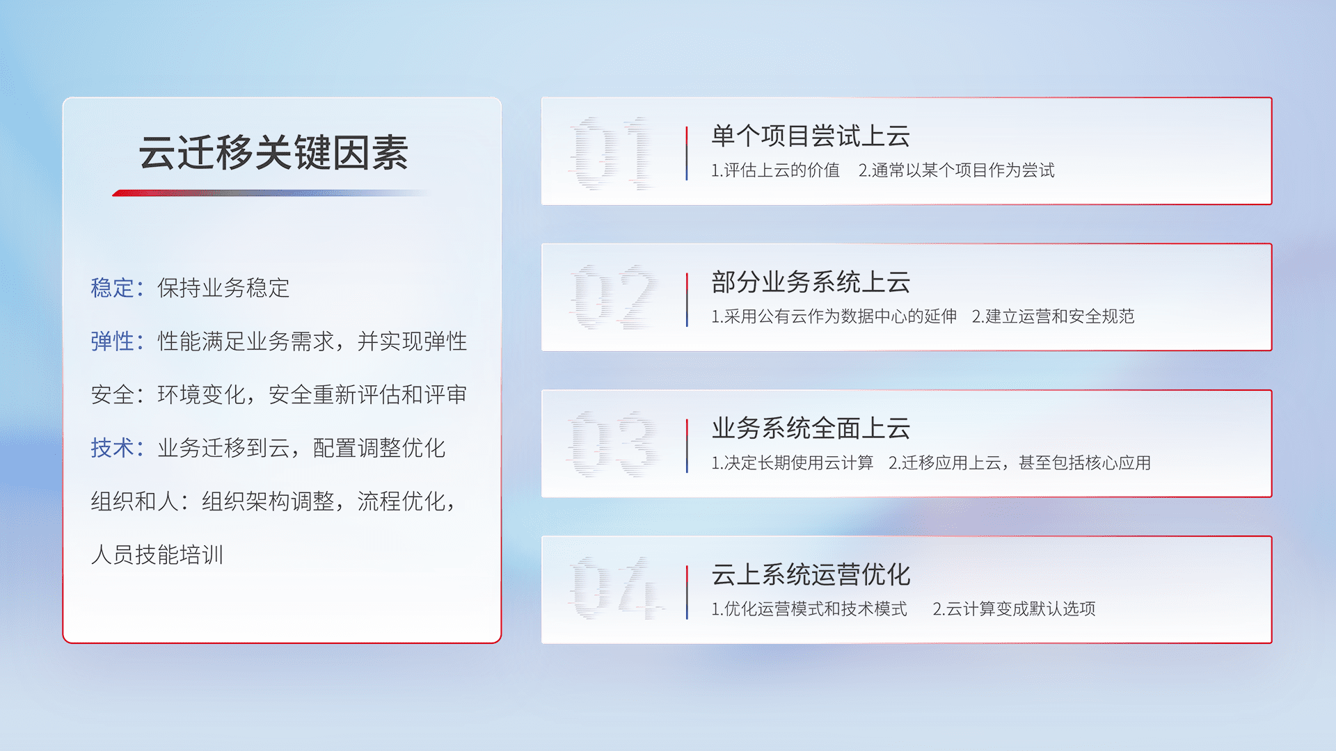 结合实际业务,,从规划设计、、云平台选型、、、云原生改造、、数据迁移、、集成交付,,迁移全过程为客户识别最佳上云路径,,,,做好风险识别管理,,设计网络架构、、身份权限、、、安全审计合规、、、、操作审计、、日志审计、、监控告警策略、、、、多站点容灾设计等,,,,对云上基础设施进行整体规划,,,提升IT治理水平,,,,以满足弹性、、、、高可用、、、高性能的需求。。